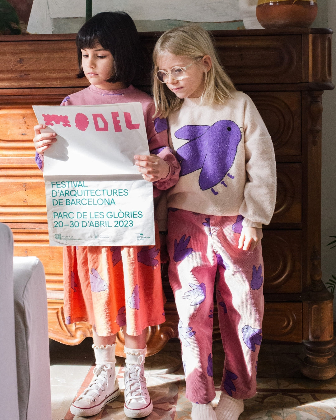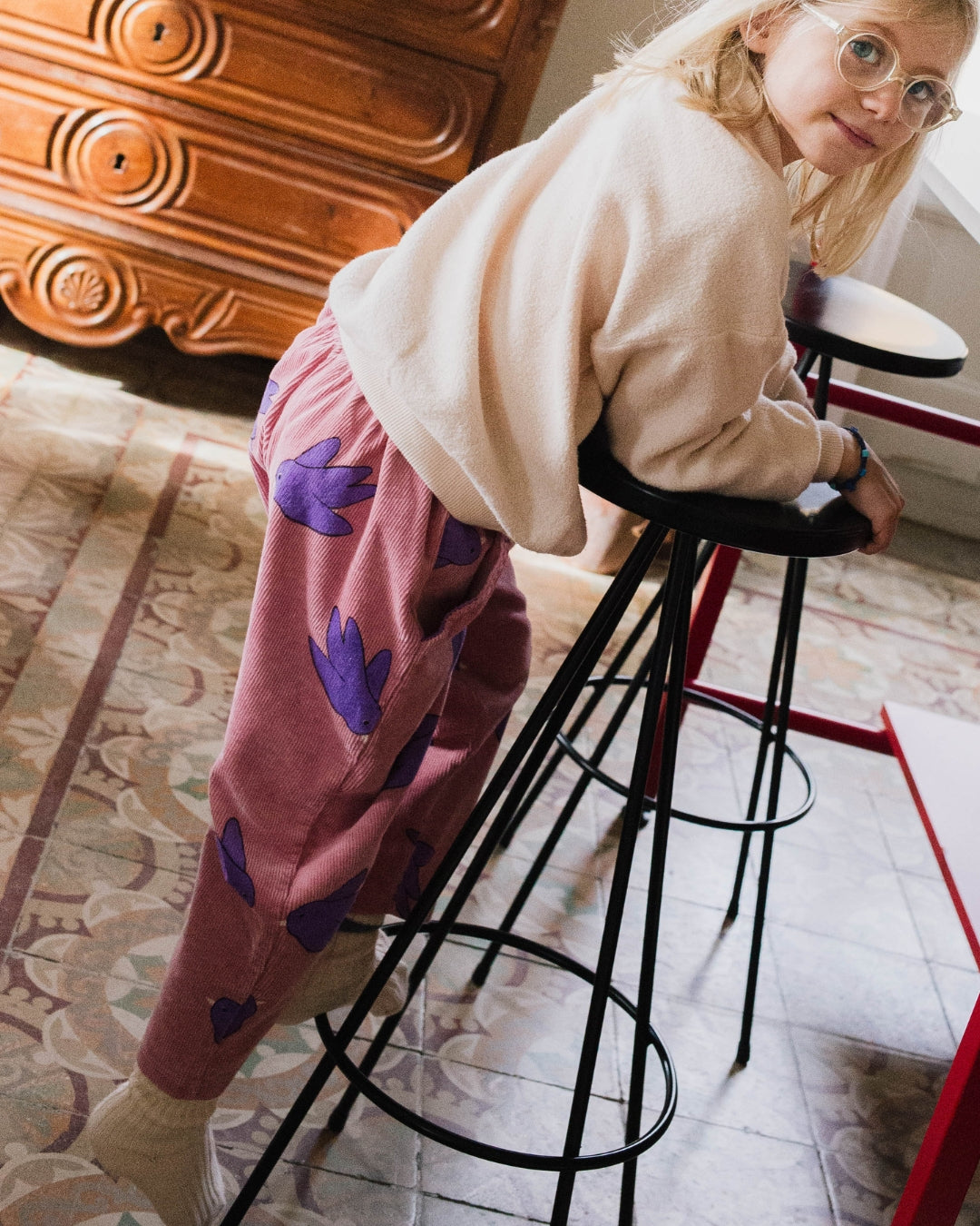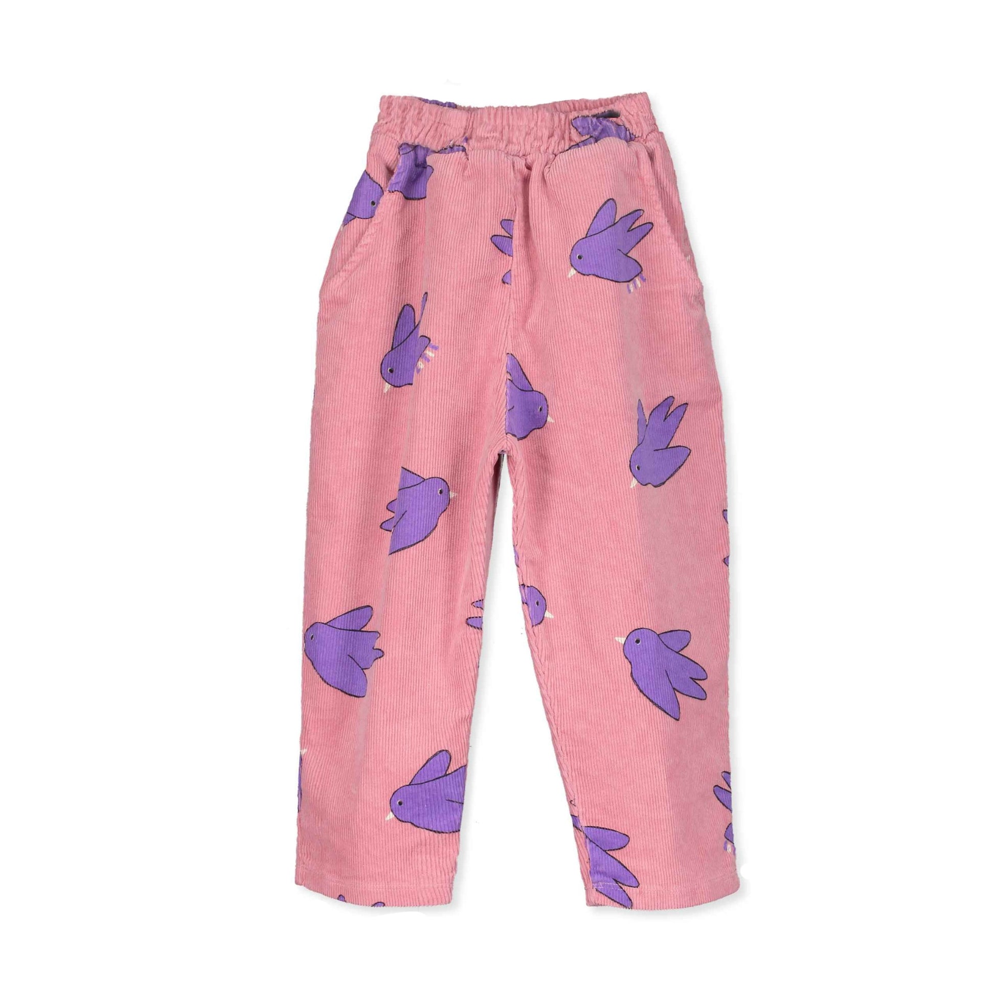 以FLOWING BIRDS滿版印花結合玫瑰色燈芯絨布料