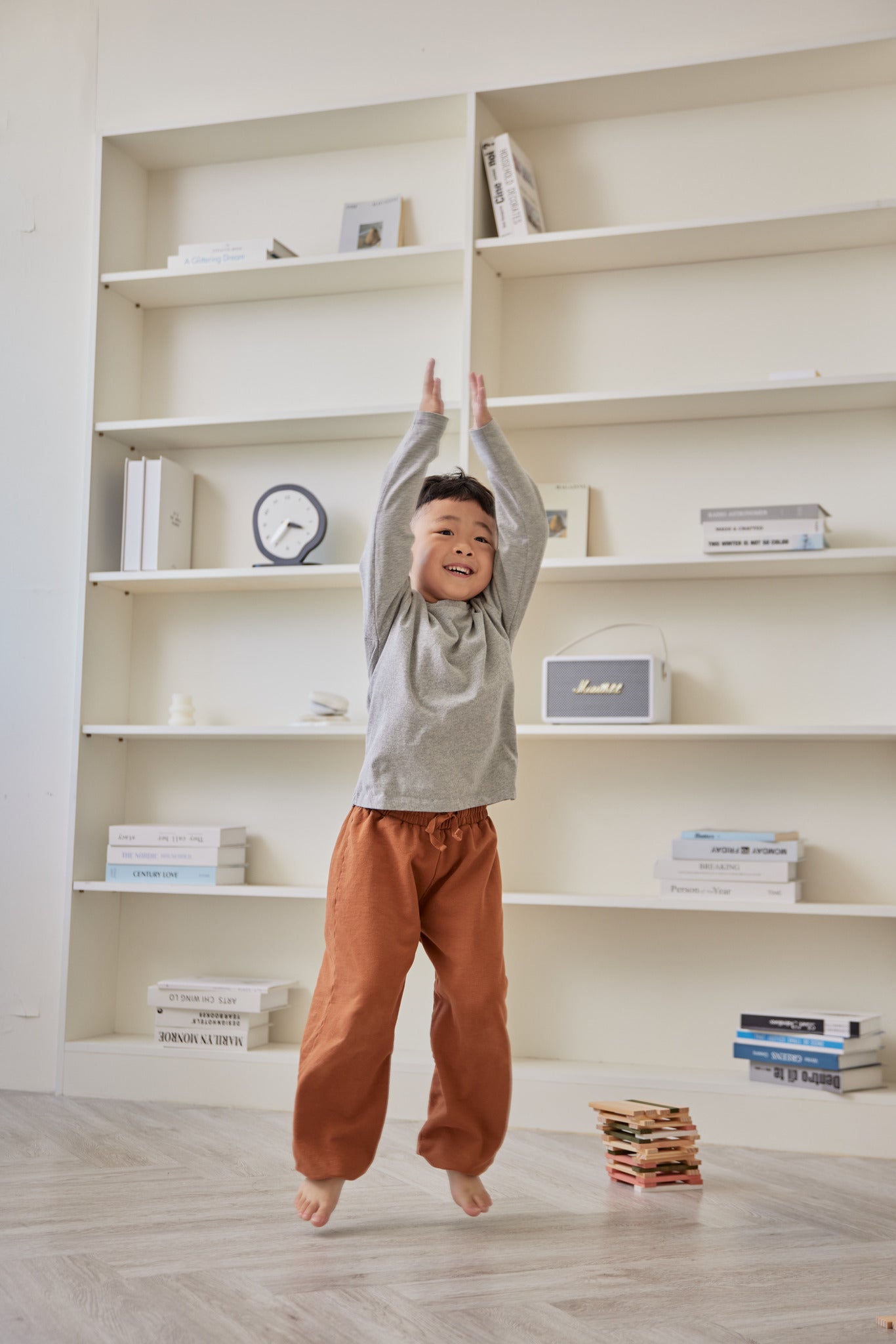 寬鬆的剪裁搭配高腰設計,輕盈的義大利刷毛布料柔軟親膚,讓孩子怎麼動都自在。